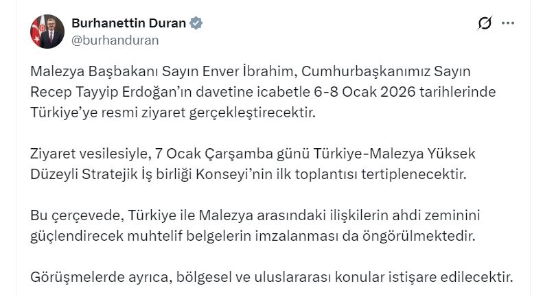İletişim Başkanı Duran, sanal medya hesabından yaptığı açıklamada, "Malezya Başbakanı Sayın Enver İbrahim, Cumhurbaşkanımız Sayın Recep Tayyip Erdoğan’ın davetine icabetle 6-8 Ocak 2026 tarihlerinde Türkiye’ye resmi ziyaret gerçekleştirecektir. Ziyaret vesilesiyle, 7 Ocak Çarşamba günü Türkiye-Malezya Yüksek Düzeyli Stratejik İş birliği Konseyi’nin ilk toplantısı tertiplenecektir. Bu çerçevede, Türkiye ile Malezya arasındaki ilişkilerin ahdi zeminini güçlendirecek muhtelif belgelerin imzalanması da öngörülmektedir. Görüşmelerde ayrıca, bölgesel ve uluslararası konular istişare edilecektir" dedi. (DHA)