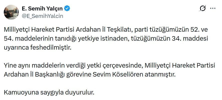 ANKARA, (DHA)- MHP Genel Başkan Yardımcısı Semih Yalçın, partisinin Ardahan İl Teşkilatı'nın feshedildiğini, il başkanlığı görevine Sevim Köseliören'in atandığını duyurdu.