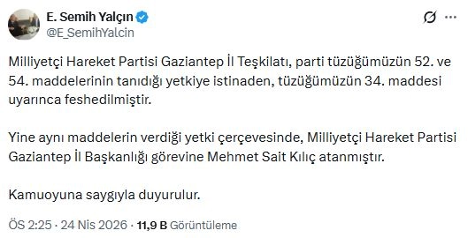 MHP'li Yalçın, sanal medya hesabından yaptığı açıklamada, "Milliyetçi Hareket Partisi Gaziantep İl Teşkilatı, parti tüzüğümüzün 52 ve 54'üncü maddelerinin tanıdığı yetkiye istinaden, tüzüğümüzün 34'üncü maddesi uyarınca feshedilmiştir. Yine aynı maddelerin verdiği yetki çerçevesinde, Milliyetçi Hareket Partisi Gaziantep İl Başkanlığı görevine Mehmet Sait Kılıç atanmıştır" ifadelerini kullandı.