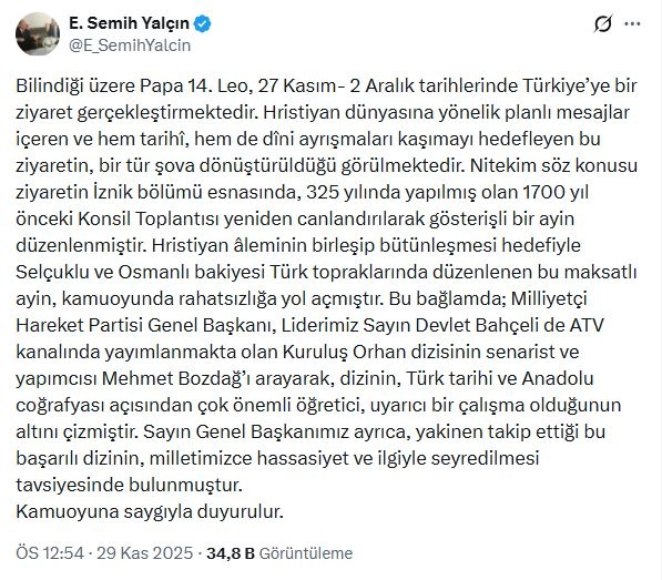 MHP Genel Başkan Yardımcısı Semih Yalçın, sosyal medya hesabından yaptığı açıklamada, "Bilindiği üzere Papa 14'üncü Leo, 27 Kasım-2 Aralık tarihlerinde Türkiye'ye bir ziyaret gerçekleştirmektedir. Hristiyan dünyasına yönelik planlı mesajlar içeren ve hem tarihi, hem de dini ayrışmaları kaşımayı hedefleyen bu ziyaretin, bir tür şova dönüştürüldüğü görülmektedir. Nitekim söz konusu ziyaretin İznik bölümü esnasında, 325 yılında yapılmış olan 1700 yıl önceki Konsil toplantısı yeniden canlandırılarak gösterişli bir ayin düzenlenmiştir. Hristiyan aleminin birleşip bütünleşmesi hedefiyle Selçuklu ve Osmanlı bakiyesi Türk topraklarında düzenlenen bu maksatlı ayin, kamuoyunda rahatsızlığa yol açmıştır. Bu bağlamda, Milliyetçi Hareket Partisi Genel Başkanı, liderimiz Sayın Devlet Bahçeli de 'Kuruluş Orhan' dizisinin senarist ve yapımcısı Mehmet Bozdağ'ı arayarak, dizinin Türk tarihi ve Anadolu coğrafyası açısından çok önemli öğretici, uyarıcı bir çalışma olduğunun altını çizmiştir. Sayın Genel Başkanımız ayrıca, yakinen takip ettiği bu başarılı dizinin, milletimizce hassasiyet ve ilgiyle seyredilmesi tavsiyesinde bulunmuştur" ifadelerini kullandı. (DHA)