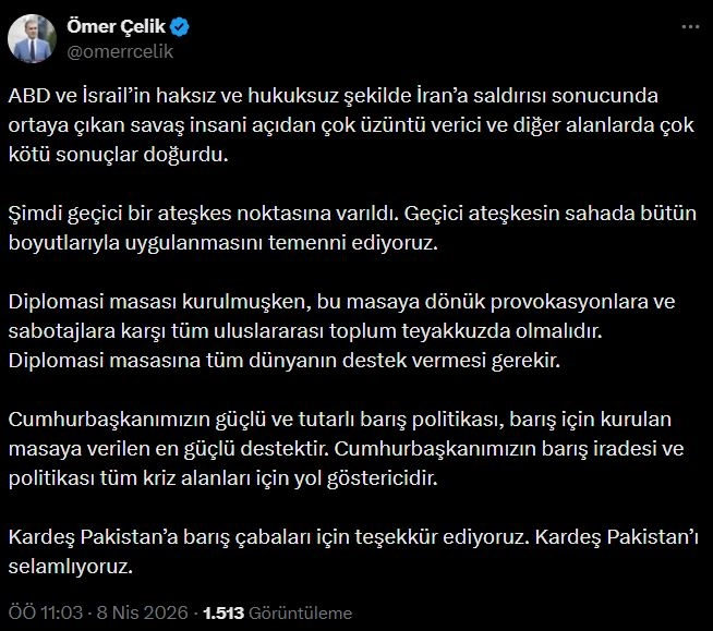 AK Parti Sözcüsü Ömer Çelik, sanal medya hesabından yaptığı açıklamada, "ABD ve İsrail’in haksız ve hukuksuz şekilde İran’a saldırısı sonucunda ortaya çıkan savaş, insani açıdan çok üzüntü verici ve diğer alanlarda çok kötü sonuçlar doğurdu. Şimdi geçici bir ateşkes noktasına varıldı. Geçici ateşkesin sahada bütün boyutlarıyla uygulanmasını temenni ediyoruz. Diplomasi masası kurulmuşken, bu masaya dönük provokasyonlara ve sabotajlara karşı tüm uluslararası toplum teyakkuzda olmalıdır. Diplomasi masasına tüm dünyanın destek vermesi gerekir. Cumhurbaşkanımızın güçlü ve tutarlı barış politikası, barış için kurulan masaya verilen en güçlü destektir. Cumhurbaşkanımızın barış iradesi ve politikası, tüm kriz alanları için yol göstericidir. Kardeş Pakistan’a barış çabaları için teşekkür ediyoruz. Kardeş Pakistan’ı selamlıyoruz" dedi. (DHA)