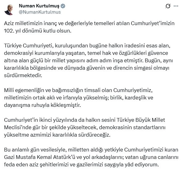 TBMM Başkanı Numan Kurtulmuş, 29 Ekim Cumhuriyet Bayramı nedeniyle sosyal medya hesabından mesaj paylaştı. Kurtulmuş, "Aziz milletimizin inanç ve değerleriyle temelleri atılan Cumhuriyetimizin 102'nci yıl dönümü kutlu olsun. Türkiye Cumhuriyeti, kuruluşundan bugüne halkın iradesini esas alan, demokrasiyi kurumlarıyla yaşatan, temel hak ve özgürlükleri güvence altına alan güçlü bir millet yapısını adım adım inşa etmiştir. Bugün, aynı kararlılıkla bölgesinde ve dünyada güvenin ve direncin simgesi olmayı sürdürmektedir. Milli egemenliğin ve bağımsızlığın timsali olan Cumhuriyetimiz, milletimizin ortak aklı ve irfanıyla yükselmiş; birlik, kardeşlik ve dayanışma ruhuyla kökleşmiştir. Cumhuriyet'in ikinci yüzyılında da halkın sesini Türkiye Büyük Millet Meclisi'nde gür bir şekilde yükseltecek, demokrasinin standartlarını yükseltme azmimizi kararlılıkla sürdüreceğiz. Bu anlamlı gün vesilesiyle, milletten aldığı yetkiyle Cumhuriyetimizi kuran Gazi Mustafa Kemal Atatürk'ü ve yol arkadaşlarını; vatan uğruna canlarını feda eden aziz şehitlerimizi ve gazilerimizi saygıyla yad ediyorum" dedi. (DHA)