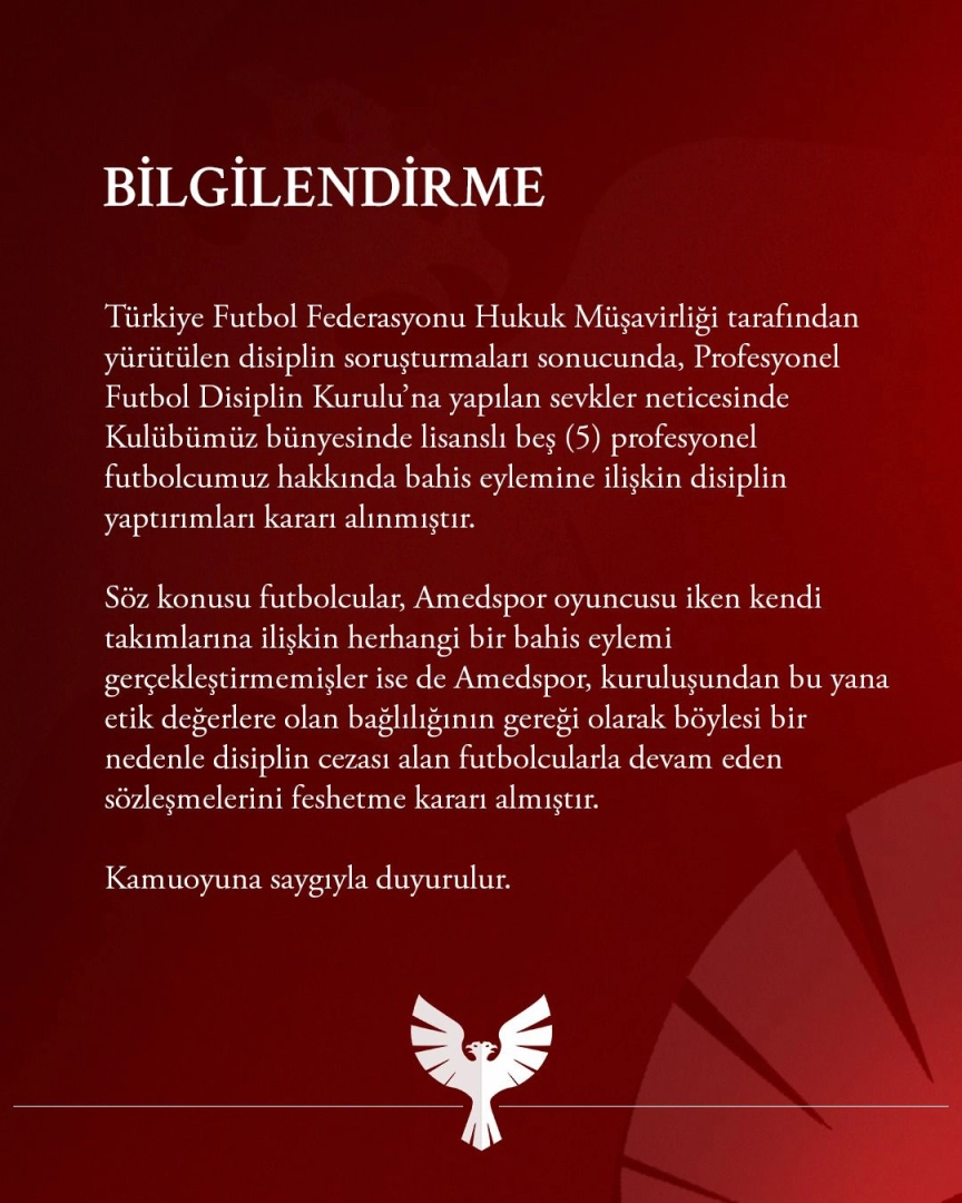 “Türkiye Futbol Federasyonu Hukuk Müşavirliği tarafından yürütülen disiplin soruşturmaları sonucunda, Profesyonel Futbol Disiplin Kurulu’na yapılan sevkler neticesinde Kulübümüz bünyesinde lisanslı beş (5) profesyonel futbolcumuz hakkında bahis eylemine ilişkin disiplin yaptırımları kararı alınmıştır. Söz konusu futbolcular, Amedspor oyuncusu iken kendi takımlarına ilişkin herhangi bir bahis eylemi gerçekleştirmemişler ise de Amedspor, kuruluşundan bu yana etik değerlere olan bağlılığının gereği olarak böylesi bir nedenle disiplin cezası alan futbolcularla devam eden sözleşmelerini feshetme kararı almıştır.” (DHA)