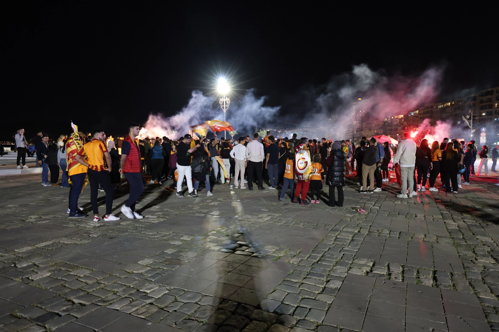 Maçın bitiş düdüğünün ardından İzmir’de Galatasaray taraftarları, sokaklara çıkarak takımlarının derbi galibiyetini coşkuyla kutladı. Kentin birçok noktasında kutlama yapan taraftarların en yoğun şekilde bir araya geldikleri yer Alsancak Mahallesi Gündoğdu Meydanı ve çevresi oldu.