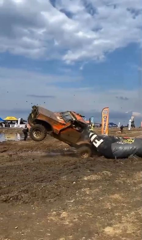 Yarışların son bölümünde ekipte yer alan bir off-road aracının taklalar atıp, bitiş balonunu devirdiği anlar, kameraya yansıdı. Görüntülerde, parkurda uçarak havalanan aracın takla atarak bitiş balonuna çarptığı, kazayı yara almadan atlanan sürücünün de aracından inerek yanına gelen ekip arkadaşlarıyla coşku yaşadığı anlar yer aldı.